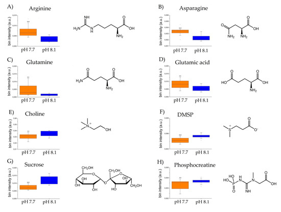 Box and Whisker’s plot of normalized bins showing the levels of discriminant metabolites of alga samples at pH 7.7 (orange) and pH 8.1 (blue) obtained by NMR analyses: (A–D) up-modulated metabolites, and (E–H): down-modulated metabolites. Student’s t-test significance is reported as: p-values = *** <0.001, ** <0.01.