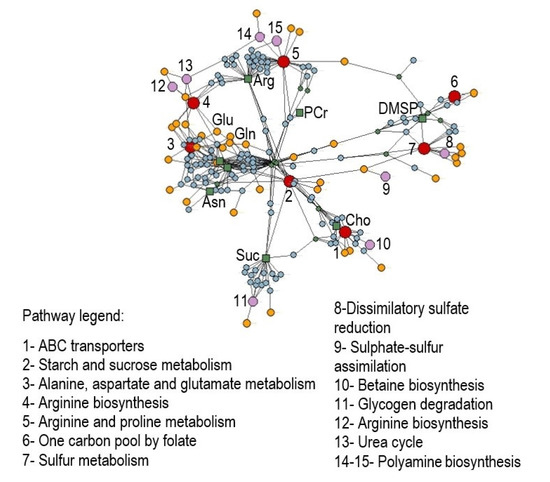 Enrichment analysis on discriminant polar metabolites obtained by NMR analyses that differentiate Ulva prolifera under acidification conditions. Networks including pathways (1–7, red dots), modules (8–15, pink dots), enzymes (yellow dots), reactions (cyan dots), and metabolites (green dots and squares) were elaborated using label propagation in a knowledge model network based on the Chlamydomonas reinhardtii database in KEGG (p < 0.05). Abbreviations: Cho = choline; Suc = succinate; Asn = asparagine; Gln = glutamine; Glu = glutamate; Arg = arginine; PCr = phosphocreatine; DMSP = dimethylsulfoniopropionate.