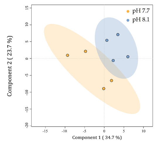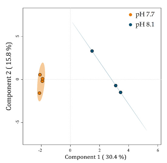 Component 1 explains 30.4% of the data variability and separates the metabolic profiles of U. prolifera cultivated at pH 7.7 on the left from those at pH 8.1 on the right. Component 2 explains 15.8% of the total variability of the data but does not separate the groups.