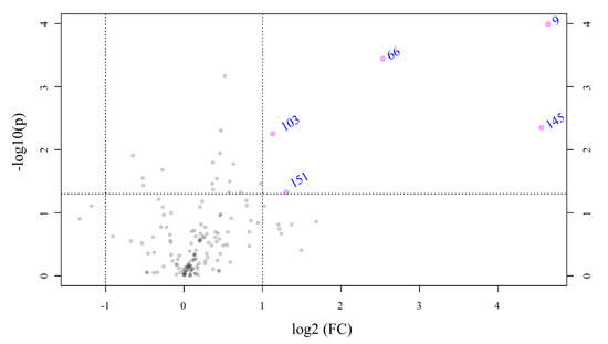 Volcano plot based on the LC-MS analyses showing metabolites with fold changes (FC) ≥ 2.0 (p ≤ 0.05) in Ulva prolifera when the pH cultivation media was modified from 8.1 to 7.7 (FC = amount at pH 7.7/amount at pH 8.1). The plot shows the −log 2 of the amount of each metabolite at pH 7.7 with respect to the amount of the same compound at pH 8.1. The pink circles and names in blue indicate metabolites with FC ≥ 2.0 at p ≤ 0.05. The data presented correspond to the statistical analysis of four biological replicates at pH 7.7 and three at pH 8.1.