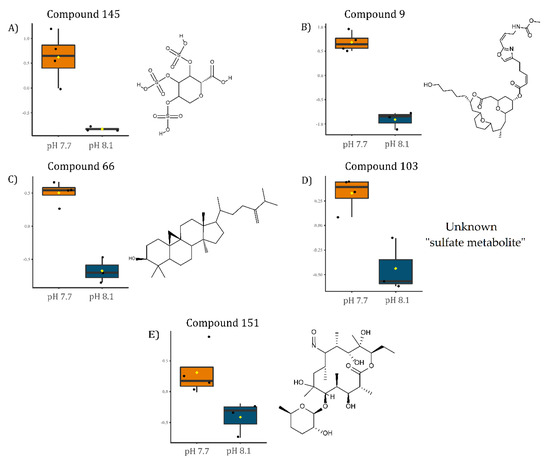 To identify the significantly modulated metabolites, a volcano plot comparing pH 7.7/8.1 was executed (FC ≥ 2.0, p-value ≤ 0.05) (Figure 6). A total of 106 metabolites appeared modulated in the algal samples under acidified conditions (pH 7.7) vs. normal conditions (pH 8.1). Five metabolites were significantly upmodulated in U. prolifera (Figure 7). All these compounds were putatively identified by comparing their MS/MS spectra acquired with those available in tools that combine free compound database searching and fragmentation prediction. Compound 145 (Figure 7A and Supplementary Figure S1) was identified as (2R)-3,4,5-Trisulfooxyoxane-2-carboxylic acid. Compound 9 (Figure 7B and Supplementary Figure S2) was identified as an oxazole-containing macrolide. Compound 66 (Figure 7C and Supplementary Figure S3) was identified as 24-methylene-cycloartanol. Compound 103 (Figure 7D and Supplementary Figure S4) is a sulfate metabolite whose structure remains unknown. Compound 151 (Figure 7E and Supplementary Figure S5) was identified as the macrolide derivative (Z)-3-[4-[[3-(dimethylamino)-5-methyloxan-2-yl]-hydroxymethoxy]propan-2-yl]-3,9-dihydroxy-6,8-dimethyl-10-oxodec-4-enoic acid.