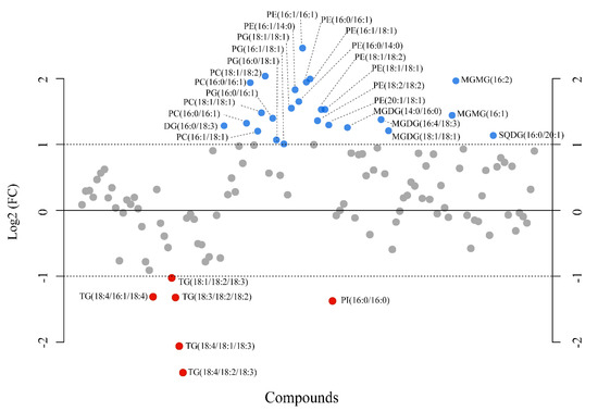 Fold-change analysis plot showing lipids with fold changes (FC) ≥ 2.0 in Ulva prolifera when the pH cultivation media was modified from 8.1 to 7.7 (FC = amount at pH 7.7/amount at pH 8.1). The plot shows the −log 2 of the amount of each metabolite at pH 7.7 with respect to the amount of the same species at pH 8.1 per mg of dry alga. Blue and red circles indicate lipids upmodulated and down-modulated, respectively. The data presented correspond to the analysis of four biological replicates for each experimental condition.