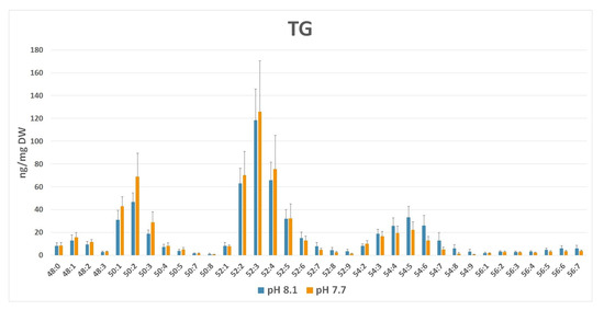 TG profile (ng/mg dry weight ± SD) in normal (pH 8.1) vs. acidic (pH 7.7) medium growth of Ulva prolifera. Lipid groups have been annotated as sum composition C:N (total number of carbons:total number of double bonds in fatty acid chains).
