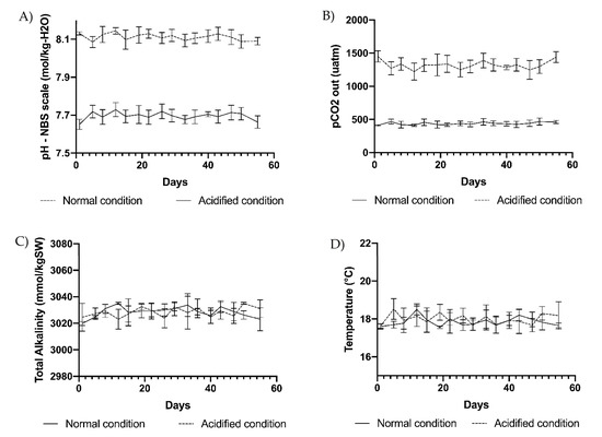 (A) pH, (B) pCO2, (C) total alkalinity, and (D) temperature measured at 3-day intervals in the 4 replicate tanks at ambient pH of 8.1 (normal condition) and in 4 replicate tanks at acidified pH of 7.7 (acidified condition). Vertical bars indicate SD on means of 4 biological replicates.