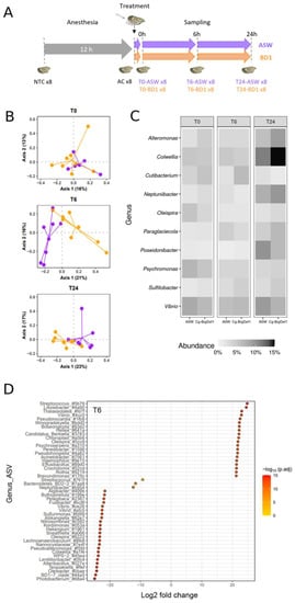 Effects of Cg-BigDef1 on β-Diversity and taxonomic composition of oyster microbiota. (A): Schematic representation of the experimental design used to test the impact of Cg-BigDef1 on the oyster microbiota after injection. From the same batch of oysters, 8 non-treated oysters were collected (NTC), the remaining oysters were anesthetized and 8 oysters were collected after 12 h (AC). The oysters were then injected with either Cg-BigDef1 at a final concentration of 5 µM (BD1) or with an equal volume of ASW (control). Oyster sampling was performed 10 min (T0), 6 h (T6) and 24 h (T24) after injection. (B): PCoA biplot based on Bray–Curtis distances showing differences between oysters injected with Cg-BigDef1 (BD1, orange) or ASW (purple) at T0, T6 and T24. (C): Mean relative abundance of bacterial genera in oyster microbiota, grouped according to oyster treatment and time after treatment. The heatmap shows the frequencies of the 10 most abundant bacterial genera in each condition. (D): Differential abundance analysis (DESeq2) at the ASV level between oysters injected with ASW and Cg-BigDef1 at T6. Each circle represents an ASV showing significant log2Foldchange (adjusted p value < 0.01) between experimental conditions. Positive log2FoldChange means enrichment in Cg-BigDef1-injected oysters and negative log2FoldChange means enrichment in ASW-injected oysters. Taxa are denoted by their attributed genus followed by the first four characters of the ASV barcode attributed by SAMBA. Note that ASVs without genera annotation were not represented in the figure.