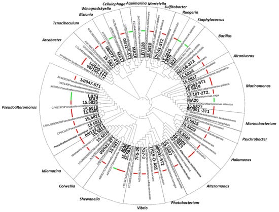 To further investigate the role of Cg-BigDefs in controlling the oyster microbiota, we built a collection of culturable bacterial strains representing 21 genera associated with healthy and diseased C. gigas [30,31]. Among them, we included genera repeatedly associated with oyster diseases, such as Arcobacter, Aeromonas, Marinomonas, Marinobacterium, Pseudoalteromonas, Psychrobacter, Sulfitobacter, Tenacibaculum, and Vibrio [21,30,32,33]. We obtained 16S rDNA sequences (V3-V4 loop) for 46 bacteria isolated from oysters with known health status (healthy or diseased). In addition, we purchased three type-strains of the genera of interest that were needed as a reference for the MALDI database (one Pseudoalteromonas and two Alteromonas). All 16S sequences exhibited ≥ 95% identity with a known type-strain sequence included in the analysis (Figure 2). For 41 strains of the 50 strains in the collection, we acquired molecular mass fingerprints by MALDI Biotyping. Strains with taxonomic assignation by 16S phylogeny but no match in MALDI databases were used to enrich the MALDI databases of marine bacteria https://doi.org/10.12770/261d7864-a44c-43ab-b0c6-57fdaf7360ac (accessed on 14 October 2022).