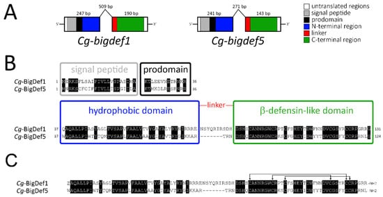 Gene structure and primary sequence of Cg-BigDef1 and Cg-BigDef5. (A): Schematic representation of Cg-BigDef1 (GenBank: JN251125) and Cg-BigDef5 (GenBank: OP191676) genes. Exons are represented by boxes; introns are represented by lines. The length of each exon/intron is displayed. Grey and black boxes represent nucleotide sequences encoding the signal peptides and prodomains, respectively, while white boxes represent untranslated regions. Blue, red and green boxes represent nucleotide sequences encoding the N-terminal hydrophobic domain, the linker region and the C-terminal β-defensin-like domain of the mature big defensins, respectively. (B): Prepropeptides. Alignment of Cg-BigDef1 (131 amino acid residues) and Cg-BigDef5 (124 amino acid residues) precursor sequences. The signal peptides, prodomains, the hydrophobic (N-terminal) and the β-defensin-like (C-terminal) domains are in boxes. Conserved amino acids are highlighted in black. The linker region is shown in red. (C): Putative mature peptides. Alignment of Cg-BigDef1 (93 amino acid residues) and Cg-BigDef5 (86 amino acid residues). Cg-BigDef1 starts with a pyroglutamic acid (Z) and ends with an amidated arginine (R-NH2). Cg-BigDef5 ends with an amidated leucine (L-NH2). Both Cg-BigDef1(1–93) and Cg-BigDef5(1–86) are folded by three intramolecular disulfide bridges as shown by arrows.