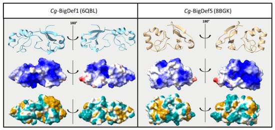 Structure comparison of Cg-BigDef1 and Cg-BigDef5. Top—Cartoon representation. Middle—Electrostatic potential on the accessible surface of the proteins with red representing negative charges and blue representing positive charges. Bottom—Hydrophobicity potential on the accessible surface of proteins with light blue representing hydrophilic properties and brown representing hydrophobic properties. Both electrostatic and hydrophobic potential were determined using ChimeraX software [42,43].