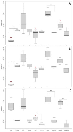The addition of formic acid to the samples before their extraction did not improve the extraction efficiency of the dissolved toxins, regardless of the nature of the sorbent. By contrast, both the SDBL and StrataX sorbents displayed a significantly lower extraction efficiency for all OVTX and LGTX in acidic conditions (0.0002 < p < 0.05, Figure 2) while no significant differences were observed using the sorbents HLB and PPL for the two OVTXs. The extraction of the LGTX was decreased in the presence of acid when using both the PPL and HLB sorbents. The addition of acid modulated the extraction efficiency of the C18 sorbent in a compound specific fashion. An improved extraction of OVTX in the presence of acid was measured (p < 0.0002, Figure 2A), whereas this was not significant for the LGTX (Figure 2B,C). Therefore, by combining high extraction efficiency, limited processing extraction time and good replicability, the SDBL cartridge at unmodified pH was selected as the best sorbent for extraction of O. cf. ovata’s dissolved toxins in seawater samples.
