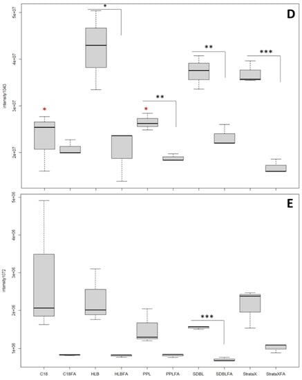 Boxplots comparing the mean intensities of the ions (A) m/z 1315.2546 (OVTX-a), (B) m/z 1337.2705 (OVTX-b), (C) m/z 987.0342 (LGTX-a), (D) m/z 1043.0673 (LGTX-b) and (E) m/z 1072.0619 (LGTX-c), in acidified (FA) and non-acidified samples. Sorbents are C18 (octadecyl bonded silica), HLB (Polymeric Phase), PPL (Styrene Divinyl Benzene), SDBL (Styrene Divinyl Benzene), StrataX (Polymeric phase). Statistical significance was assessed with the following threshold: * 0.05 < p < 0.5; ** 0.005 < p < 0.05, *** p < 0.005. Black stars compare acidified versus non acidified conditions for one sorbent type, whereas red stars compare one sorbent type to the SDBL sorbent.