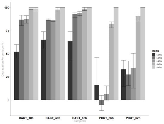 Degradation percentages normalized to control samples (BLK) collected at the same sampling times (%) and their standard deviation for LGTX-a, LGTX-b, LGTX-c, OVTX-a and OVTX-b, under conditions of bacteria exposure (BACT) at 10, 36 and 62 h or natural sunlight (PHOT) at 36 and 62 h.