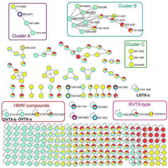 Molecular network representing the relationships between the ions detected in the three treatments: BLK (light blue), PHOT (yellow) and BACT (red). Grey pies represent either L1 media or analytical blanks. Rectangles mark the three clusters A, B and C mentioned in the text as well as two group of compounds, high molecular weight (>2000 Da, red) and RVTX-type ions (pink). The lost ions listed in Table 1 are marked with a colored border: dark blue for the PHOT treatment, orange for the BACT treatment and purple when the ions are lost in both PHOT and BACT treatments. The singletons corresponding to OVTX-a, OVTX-b and LGTX-c are also indicated.