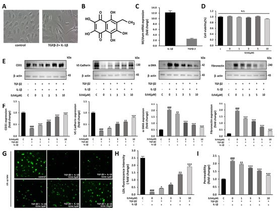 EchA inhibits EndMT in HUVECs. (A) EndMT is induced by TGF-β2 and IL-1β in HUVECs. Untreated HUVECs or TGF-β2 and IL-1β-treated HUVECs were examined for morphological changes using a light microscope (100 × magnification). (B) The chemical structure of EchA. (C) TGF-β2 and IL-1β mRNA expression levels were quantified in the sham control and MI groups. Compared with the sham control group, TGF-β2 and IL-1β mRNA expression levels in the MI group were increased. (D) The cells were pretreated with different concentrations of EchA (0, 1, 3, 5, and 10 μM) for 24 h. Cell viability was determined by the CCK-8 assay (n = 5). (E,F) The relative density of CD31, VE-cadherin and α-SMA, in addition to fibronectin protein bands, were analyzed by Western blot with β-actin as the control. (G) Fluorescence microscopic images of FL-LDL uptake in HUVECs incubated with LDL (40× magnification). (H,I) Permeability tests were performed after HUVECs were incubated with TGF-β2 and IL-1β and with different concentrations of EchA (0, 1, 3, 5, and 10 μM) for 24 h. EchA inhibits TGF-β2- and IL-1β-induced monolayer permeability of HUVECs. ### p < 0.001 vs. HUVECs without EchA and TGF-β2 and IL-1β treatment; * p < 0.05, ** p < 0.01, *** p < 0.001 vs. TGF-β2- and IL-1β-induced HUVECs without EchA treatment. Data are expressed as X-fold induction compared to normal control. N.S., not significant.