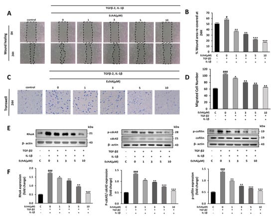 EchA suppresses migration of TGF-β2- and IL-1β-stimulated HUVECs. (A) Representative images of HUVECs after treatment with different EchA concentrations (0, 1, 3, 5, and 10 μM) for 24 h. Serum-starved HUVECs were first scratched using a 200 μL tip, and subsequently treated with TGF-β2 and IL-1β for 24 h. The images of the wounds were obtained at 0 and 24 h using a light microscope (40× magnification). (B) The area between the wound edges was measured and compared among the groups. (C) Representative images of migrated TGF-β2- and IL-1β-stimulated HUVECs in transwell chamber assay after treatment with different concentrations (0, 1, 3, 5, and 10 μM) of EchA for 24 h using a light microscope (40× magnification). (D) The number of migrated cells was measured and compared among the groups. (E,F) Relative density analysis of the RhoA protein bands by Western blot with β-actin as the control. Relative density analysis of phosphorylated Cdc42 and cofilin protein bands by Western blot with Cdc42 and cofilin as the controls. # p < 0.05, ### p < 0.001 vs. HUVECs without EchA and TGF-β2 and IL-1β treatment; * p < 0.05, ** p < 0.01, *** p < 0.001 vs. TGF-β2- and IL-1β-induced HUVECs without EchA treatment. Data are expressed as X-fold induction compared to normal control.