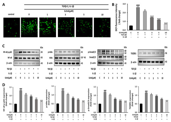 The intracellular generation of ROS, as an index of oxidative stress, was determined using H2DCFDA (Ex/Em = 492–495/517–527 nm, Invitrogen, Carlsbad, CA, USA). H2DCFDA is a cell-permeable probe. After diffusing into cells, it is metabolized into non-fluorescent DCF, which is subsequently oxidized by intracellular ROS into highly fluorescent DCF. HUVECs seeded into six-well plates (2 × 105 cells/well) were treated with varying concentrations of EchA, as previously described. After 1 h of incubation with TGF-β2 and IL-1β, HUVECs were rinsed with phosphate-buffered saline (PBS) and incubated with 5 µM H2DCFDA in serum-free medium in a light-free chamber for 30 min.