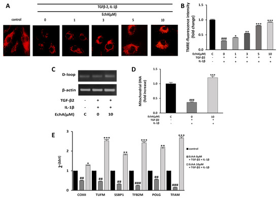 Mitochondrial dysfunction can induce fibrotic diseases [24]. Moreover, many studies that have investigated mitochondrial function during EMT have found that TGF-1β treatment impairs mitochondrial function by increasing ROS production and reducing mitochondrial membrane potential, ATP content, mitochondrial DNA content, and mitochondrial complex protein expression [25,26,27]. Our recent study demonstrated that EchA significantly increased mitochondrial mass and oxidative phosphorylation function, which enhanced the mitochondrial energy efficiency by modulating major mitochondrial biogenesis regulatory genes, including PGC-1α and NRF-1 [28]. Therefore, we examined whether EchA improves mitochondrial dysfunction by inhibiting TGF-β2- and IL-1β-induced EndMT in HUVECs. First, the mitochondrial membrane potential was measured using TMRE fluorescence. Compared with the control group, the mitochondrial membrane potential was significantly decreased in the TGF-β2- and IL-1β-stimulated group. Conversely, EchA (1, 3, 5, and 10 μM) treatment significantly increased the mitochondrial membrane potential of the TGF-β2- and IL-1β-stimulated group (Figure 4A,B). In addition, compared with the TGF-β2- and IL-1β-stimulated group, mitochondrial DNA content significantly increased in the EchA (10 μM) treatment group (Figure 4C,D). To evaluate the mitochondrial function, we examined the expression levels of mitochondrial biogenesis-regulated genes using qPCR. The results of qPCR demonstrated that the expression levels of these genes were significantly increased after treatment with EchA, compared with the TGF-β2- and IL-1β-stimulated groups (Figure 4E). Overall, these results suggest that ECs undergoing EndMT have a protective effect against mitochondrial dysfunction, due to EchA treatment.