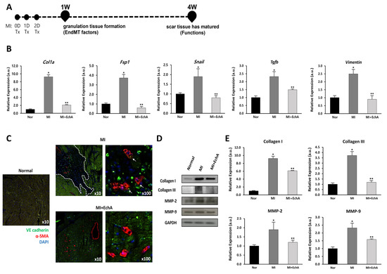 To verify the effect of EchA on the EndMT process, EndMT-related genes were measured in mouse cardiac tissue from MI or EchA-treated MI. EndMT genes, including Col1a, Fsp1, Snail, Tgfb, and vimentin, are known to be altered in ischemic conditions [33,34,35,36,37]. We also examined these changes (Figure 5B). Compared to the control group, the expression of Col1a, Fsp1, Snail, Tgfb, and Vimentin increased 9.2-, 3.6-, 1.7-, 2.3-, and 2.5-fold, respectively, in the MI group. In the EchA-treated MI group, the expression levels of these genes decreased to almost normal levels. Double immunofluorescence staining, performed to detect the expression of the endothelial junction protein VE-cadherin and mesenchymal marker α-SMA, was consistent with the evidence for EndMT in the MI group (Figure 5C). In contrast, cells that express mesenchymal markers were rarely detected in the EchA-treated MI group. MMP-2 and MMP-9 are involved in myocardial remodeling after MI, and collagen I and III, well-known fibrosis-related factors [30,38], were identified at the protein level. We confirmed that the relatively high protein expression rate in MI was downregulated after EchA treatment (Figure 5D,E). Given this finding, it is important to demonstrate that EndMT is effectively regulated by EchA treatment in response to ischemic conditions in the heart.