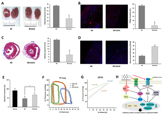 EchA exerts cardioprotective effects after myocardial infarction. (A) Representative photo and column scatter plot of infarct size determined through TTC staining. Infarct size (%) was calculated as the ratio of the infarcted area (pale) to the risk area (deep red). Distance between white columns = 1 cm. (B) TUNEL assay (TUNEL-positive cells, pink; DAPI, blue) was performed 1 week following MI. (C) Masson’s trichrome staining of cardiac sections 1 week after establishing MI (collagen fibers, light blue; muscle fibers, red). (D) Immunofluorescence staining for CD31 1 week after MI (CD31-positive microvessels, red; DAPI, blue). (E) Ejection fraction. (F) Representative pressure–volume loop. (G) End-systolic pressure–volume relationship (ESPVR). (H) A schematic summary of the regulation of EndMT by treating EchA in ischemic hearts. * p < 0.05 vs. MI group. Data are expressed as X-fold induction compared to normal control. All values are mean ± standard deviation. Statistical significance was assessed by one-way ANOVA.