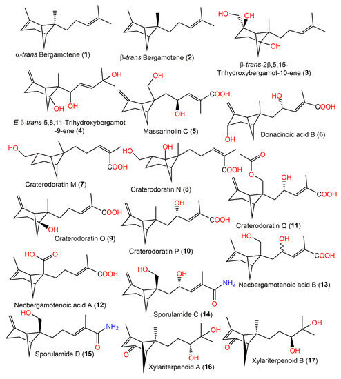 Structures of bicyclic bergamotane sesquiterpenoids (1–17).