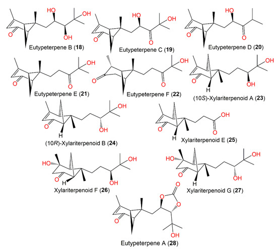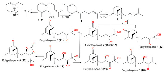 Biosynthetic pathway of eutypeterpenes A–F (compounds 18–22 and 28) [].