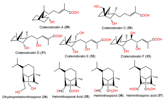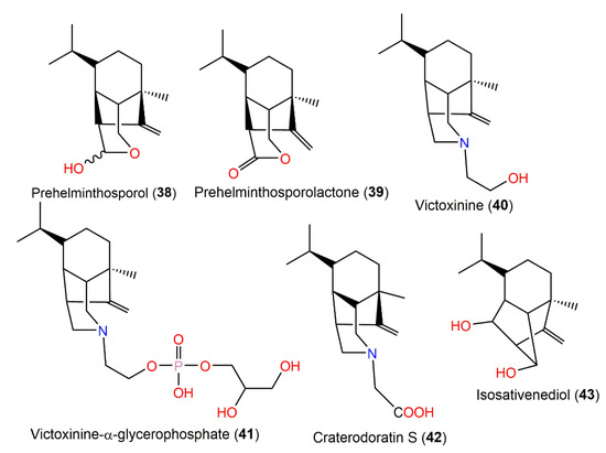 Prehelminthosporol (38) and dihydroprehelminthosporol (34) along with compounds 35–37, 39, 40, and 43 were separated by SiO2, flash CC, and preparative TLC from the EtOAc extract of the Bipolaris species, which is a Sorghum halepnse (Johnson grass) pathogen (Figure 3). These metabolites were assessed for their phytotoxic potential towards Sorghum bicolor (Sorghum) and Sorghum balepense (Johnson grass) in leaf spot assays [,]. Compounds 34, 38, and 39 produced similar lesions to those caused by the fungus in the field. The lesions appeared as a reddish-brown area (0.3–0.5 cm diameter) surrounded by a black circle with an outer chlorotic zone. Compounds 34 and 38 (concentration of 25 μg/5 μL) had comparable toxic effectiveness, while compound 38 maintained its effect at a lower concentration of 2.5 μg/5 μL; meanwhile, the other compounds were non-toxic [,]. Victoxinine was also toxic to cereals in the order of oats > rye and barley > wheat > sorghum in a root inhibition assay []. The phytotoxic influence of compounds 34 and 38–40 versus sorghum, corn, bent-grass, sickle-pod, and morning glory was also assessed in leaf spot assays. Moreover, victoxinine caused a water-soaked translucent appearance with defined irregular necrotic edges. It is worth mentioning that 3-deoxyanthocyanidins are sorghum stress response metabolites (phytoalexins), which were accountable for the red wound response. Compounds 34, 38, and 39 were elicitors of a very strong reddening compared with the wounding-produced reddening, but compound 40 did not elicit a sorghum phytoalexin response. In bent grass and corn, compounds 34 and 38–40 produced a light-brown area limited by a chlorotic region, whereas in sickle pod and morning glory, they showed necrotic lesions that extended at high concentrations beyond the under-drop area. It is noteworthy that compound 38 was the most toxic compound versus all tested plants except for the morning glory [].