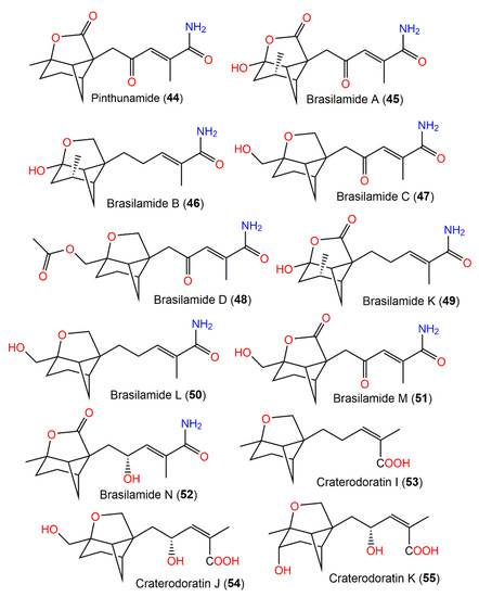 From Paraconiothyrium brasiliense, new tricyclic sesquiterpenoids, brasilamides A–D (45–48) and the formerly reported pinthunamide (44), were separated from the culture’s EtOAc extract utilizing SiO2/Sephadex LH-20 CC and HPLC. Their structures were established using NMR and X-ray analyses (Figure 5). Compounds 45 and 46 are rare metabolites having a 4-oxatricyclo[3.3.1.02,7]nonane moiety with a tetrahydro-2H-pyrone or a tetrahydro-2H-pyran linked with bicyclo[3.1.1]heptane ring at C-5 and C-2, whereas compounds 47 and 48 are analogs of 44, possessing an unprecedented 9-oxatricyclo[4.3.0.04,7]-nonane core.