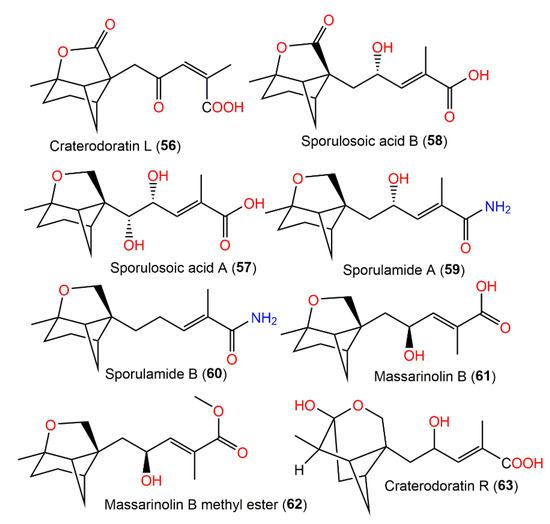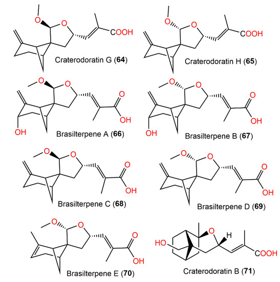 Their structures with absolute configurations were established by spectral, X-ray diffraction, and ECD analyses and NMR calculations. Compounds 29 and 71 possess a rare skeleton, where the C-14methyl in 71 showed a further 1,2-migration. On the other hand, compounds 7–11, 53, 55, 56, and 63–65 belong to β-pinene derivatives that produced 30–33 through an alkyl migration (Figure 7). Compounds 7–10, 30, 42, 55, 61, and 88 demonstrated potent inhibitory potential versus LPS-caused B lymphocyte cell proliferation (IC50s ranged from 0.67 to 22.68 μM) in BALB/c mice compared with cyclosporin A (IC50 of 0.47 μM), where compound 61 (IC50 0.67 μM) had the most potent effectiveness. Moreover, compounds 11 and 61 possessed inhibition (IC50s of 31.50 and 0.98 μM, respectively) on T lymphocyte cells proliferation induced by ConA (concanavalin A) compared with cyclosporin A (IC50 0.04 μM). Structurally, it was noted that the α,β-unsaturated-carboxylic acid unit could be the key functional group for the immunosuppressive potential of these metabolites. Furthermore, compounds 61 and 7–10 with a β-pinene main core had a wider range of bioactivities [].