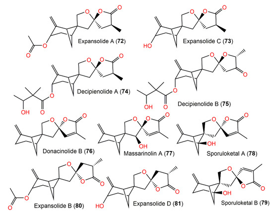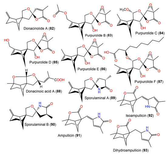 From Podospora decipiens, two new tetracyclic sesquiterpenoids, decipienolides A (74) and B (75), were separated from the EtOAc extract by SiO2 CC and HPLC analyses. They were obtained as a mixture of inseparable epimers, having a 3-hydroxy-2,2-dimethylbutyric acid sidechain as elucidated by an NMR analysis (Figure 8). The 74/75 mixture had an antibacterial influence versus B. subtilis (inhibition zone diameter of 9–10 mm, concentration of 200 µg/disk). Neither of them demonstrated capacity versus Ascobolus furfuraceus NRRL6460, Sordaria fimicola NRRL6459, and C. albicans ATCC90029 []. Donacinolides A (82) and B (76) (concentration of 50 μg/mL) revealed weak inhibition versus Salmonella enterica subsp. enterica (inhibition rates of 24.3, 23.9, and 26.2%) in the microdilution assay []. Furthermore, there were no observed antibacterial activity for purpurolides B (83) and C (84) (concentration of 50 μM) versus E. coli ATCC25922, M. smegmatis mc2155 ATCC70084, S. aureus ATCC25923, and S. epidermidis ATCC12228 [].