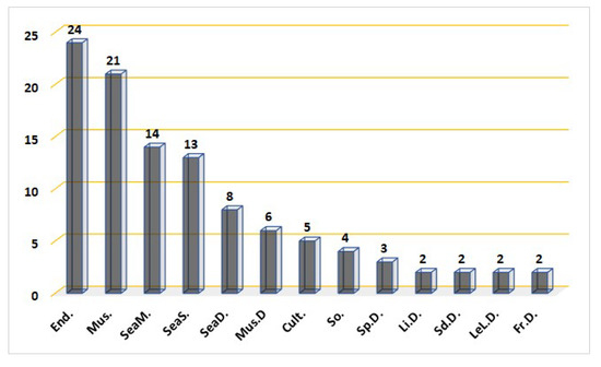 Number of bergamotane sesquiterpenoids reported from fungi derived from various sources. End.: endophytic; Mus.: mushroom; SeaM.: sea mud-derived; SeaS.: sea sediment-derived; SeaD.: sea deposit-derived; Mus.D: mushroom-derived; Cult.: cultured; So.: soil-derived; Sp.D.: sponge-derived; Li.D.: lichen-derived; Sd.D.: sheep dung-derived; LeL.D.: leaf litter-derived; Fr.D.: fruit-derived.