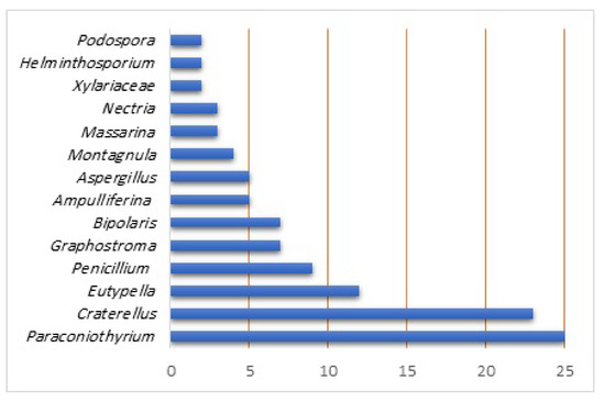 The majority of compounds have been reported from Paraconiothyrium (25 compounds), Craterellus (23 compounds), and Eutypella (12 compounds) species (Figure 12). Interestingly, many of these metabolites normally occurred as inseparable mixtures. These metabolites were assessed for diverse bio-activities. It is obvious that cytotoxic evaluation accounts for the largest proportion of biological assessments, where they had weak or no effectiveness on the tested cell lines. On the other hand, there are limited reports on their phytotoxic, plant growth regulation, antimicrobial, anti-HIV, cytotoxic, anti-inflammatory, pancreatic lipase inhibition, immunosuppressive, and antidiabetic activities. Therefore, this suggested more potential for trying other types of pharmacological effectiveness. Victoxinine (40) and prehelminthosporolactone (39) displayed potential phytotoxic capacities; therefore, they could be utilized as bioherbicides or as lead metabolites for synthesizing more efficacious phytotoxic compounds against various weeds. Pinthunamide (44), ampullicin (91), isoampullicin (92), and dihydroampullicin (93) were found to selectively promote the root growth. However, the phytotoxic and plant growth promotion potential should be transferred from laboratory experiments into field settings for assessing the environmental influences on these activities. Purpurolide F (87) had potent pancreatic lipase inhibition potential that could be a viable candidate as a pancreatic lipase inhibitor for further clinical development. Massarinolin B (61) had prominent immunosuppressive potential, suggesting further in vivo and mechanistic investigations for the development of this metabolite as an immunosuppressant. In silico studies for the reported metabolites that have not been tested or have had no noticeable effectiveness in the estimated activities could be a possible area of future research. Moreover, synthesis and structural modifications of these metabolites may produce more potential and useful tags of these metabolites through click chemistry, which is a new approach for synthesizing drug-like molecules that can boost the drug discovery process.