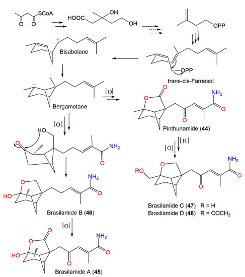 Biosynthetic pathways of brasilamides A–D (45–48) [].