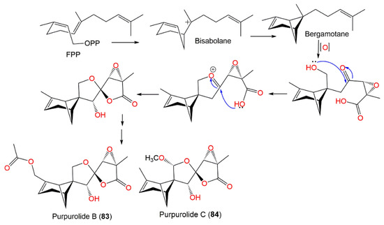 Biosynthetic pathway of purpurolides B and C (83 and 84) [].