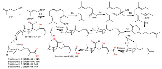 Biosynthetic pathway of brasilterpenes A-E (66–70) []. IPP: isopentenyl diphosphate; FS: farnesyl synthase; NPP: nerolidyl diphosphate; TC: terpenyl cyclase; DMAPP: dimethylallyl diphosphate; FPP: farnesyl diphosphate.