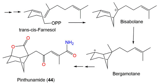 Kimura et al. purified the tricyclic amide sesquiterpenoid pinthunamide (44) from the acetone extract of Ampulliferina sp. at pH 2.0 utilizing SiO2 and sephadex LH20 CC processing as well as crystallization from EtOAc extract, which gave positive NH2OH-HCI-FeCl3 and KMnO4 reactions []. The compound was assigned by X-ray diffraction and NMR methods. Its plant growth regulation effectiveness was evaluated using a lettuce seedling assay, where it (dose 300 mg/L) produced a 150% root growth acceleration over the control seedlings (100%) while scarcely influencing the hypocotyl elongation at the tested concentrations []. Its structure combined a unique configuration of six-, five-, and four-membered rings that was proposed to be biosynthesized via the mevalonate/trans-cis-farnesol/bisabolene/bergamotane pathway (Scheme 5) [].