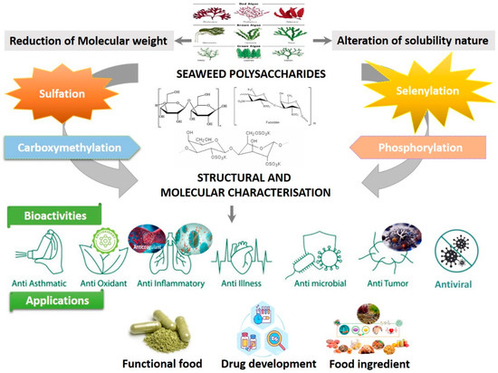 Algal derived polysaccharides have gained much interest owing to their abundance as the main cell wall constituent as well as their unique physicochemical and biological properties [1]. Marine algal polysaccharides, including laminarin, fucoidan, ulvan, carrageenan, and alginate, have been widely explored for food, pharmaceutical and biomedical applications [2,3]. Polysaccharides are building blocks of about 30–50 monosaccharide units linked together by glycosidic bonds, together with many complex sugars to form cross-linked high–molecular weight biological macromolecules [4]. Initially, polysaccharides were used as thickening agents in industrial applications but recently have attracted much attention from the scientific community for their reported therapeutic potential [2,5]. The demand for novel, pure and highly biologically active polysaccharides is rapidly increasing, and their increased interest from researchers in exploiting natural algal resources. Algal biomass is a renewable bioresource and the recovered polysaccharides are safe, biodegradable, and biocompatible [2].