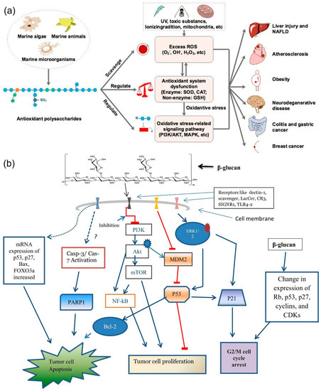 Laminarin is a dual regulator of apoptosis and cell proliferation, similar to β-Glucan [96]. Marine-derived antioxidant polysaccharides have three distinct mechanisms, including scavenging the ROS, regulating the antioxidant system or oxidative stress-mediated signaling pathways [97] (Figure 3a). The mechanism of β-glucan can activate different signaling pathways to regulate tumor cell proliferation, cell apoptosis, and cell cycle arrest, which can involve antioxidant, antitumor, and anti-inflammatory and immunostimulatory properties. Laminarin possesses potent antioxidant activity [52,59,69]. The mechanisms of antioxidant action in β-glucan with various pathways are shown in Figure 3b.