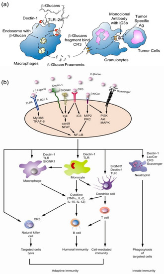 Immunomodulatory mechanism of β-glucan. (a) The uptake and subsequent actions of β-glucan on immune cells (b) Immune activation induced on a variety of membranes. Reprinted with permission from reference [74]. Copyright 2022, Chan et al.