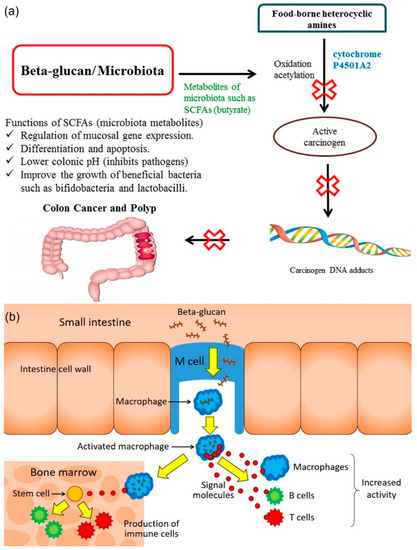 Mode of action in intestinal gut health (a) Action of absorption of β-glucan (b) influence of β-glucan in colon cancer via the gut microbiota. Reprinted with permission from reference [99]. Copyright 2022, Jayachandran et al.