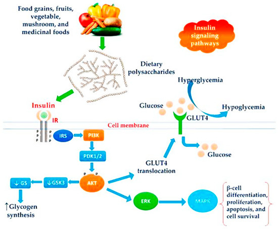 Schematic representation of the antiobesity action of dietary polysaccharides on the insulin signaling pathway. Reprinted with permission from reference [44]. Copyright 2022, Ganesan and Xu et al.