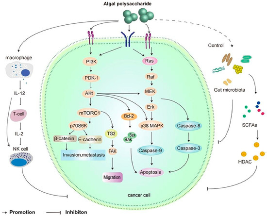 Antitumor activity can inhibit cell apoptosis through a signaling pathway such as the mitochondrial pathway. Laminarin and laminarin sulfate possess direct cytotoxic activity against different types of tumor cells and have been shown to directly destroy cancer cells in studies using in vitro and in vivo models. Notably, laminarin also enhances T and B cells, macrophages, NK cells, and other immune cells, which can stimulate different complementary pathways and characterized by secretion of higher levels of anti-inflammatory cytokines for the regulation of the immune system. Algal polysaccharides help in the induction of apoptosis, cell proliferation, tumor angiogenesis, regulation of immune function and improve the effects of chemotherapy drugs on tumor cells in cancer therapy [101,106]. Laminarin was shown to be a potential therapeutic agent for human colon cancer by inhibiting cell proliferation due to the sulfated modification changing the molecular structure and spatial conformation of the polysaccharide, leading to changes in biological activity. The hydroxyl group of a sugar unit can be replaced by a sulfate group in laminarin. Thus, the conformation of the sugar chains changes, and the formation of a non-covalent bond further adds to the advantages of laminarin for antitumor activity. The mechanism of antitumor activity for algal polysaccharides is outlined in Figure 8.