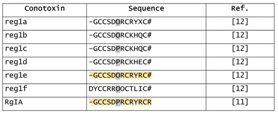Sequences of reg1a–f and RgIA. X, unidentified amino acid; O, hydroxyproline; #, amidated C-terminal. Grey, note that Pro6 is hydroxylated in reg1a,b,e,f; orange, note the high sequence homology between reg1e and RgIA [11,12].
