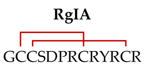 α-RgIA (or RgIA) is the most documented α-conotoxin described in C. regius. RgIA was identified using a PCR-based discovery method, which later allowed its synthesis using standard Fmoc chemistry [11]. This peptide is characterized by the cysteine framework I (CC-C-C) and displays a globular disulfide connectivity (Figure 2) [30].