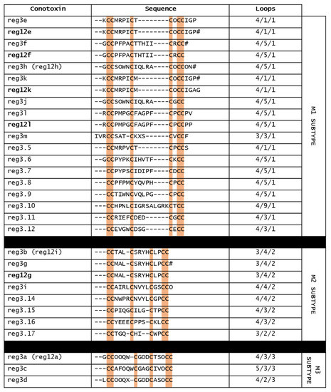 Conotoxins of the M-superfamily have been found in the venom of all Conus species [104]. Normally, M-superfamily conotoxins display a cysteine framework III (CC−C−C−CC), with a wide variability in the cysteine pattern and size of the three loop regions. Furthermore, compared to framework I of α-conotoxins, M-conotoxins having the framework III are constrained by three disulfide bonds. Within this gene superfamily, there are five M-subtypes (M1–M5), based on the number of amino acids in the third loop. M1–M3 conotoxins are grouped in “mini-M” (<22 residues), whereas M4 and M5 belong to the “maxi-M” group (>22 residues) [104,105]. While the latter are the better-known M-superfamily conotoxins, unfortunately little is known about mini-M conotoxins. Figure 6 shows the sequences of the mini-M conotoxins found in the venom of C. regius.