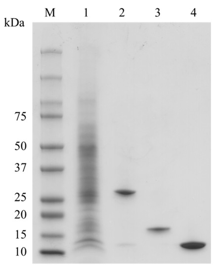 Purification of Bryopsis plumosa lectins (BPLs). M, Molecular weight marker; lane 1, crude extract; lane 2, BPL1; lane 3, BPL2; lane 4, BPL3.