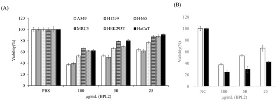 BPL2 inhibited the viability of lung cancer cell lines, whereas BPL1 and BPL3 did not show the inhibitory activity of the tested cell lines at any concentration (Supplementary Figure S1). Cell viability was dependent on the BPL2 concentration and exposure time. BPL2 activity was most effective in the A549 and H1299 lung cancer cell lines, with cell viability being approximately 40% at 100 μg/mL of BPL2 after exposure for 24 h. However, weak toxicity towards non-cancerous cell lines (MRC5, HEK293T, and HaCaT) was observed at 100 μg/mL (~60–70% viability) (Figure 2A). The increase in the exposure time of BPL2 affected cell viability; cell viability was reduced to approximately 20% after 72 h of exposure (Figure 2B). Based on the cytotoxicity results in non-cancerous cell lines, subsequent experiments were performed at a BPL2 concentration of fewer than 25 μg/mL.