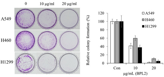 According to the colony-forming assay, BPL2 was effective at low concentrations. All cancer cell lines disappeared after treatment with 20 μg/mL of BPL2. In addition, half of the colonies did not survive at 20 μg/mL BPL2 (Figure 3).
