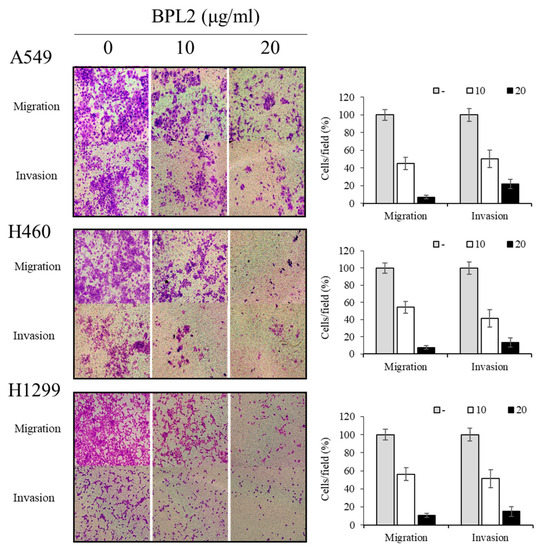 BPL2 strongly inhibited the invasion and migration of lung cancer cells in the various cell lines (A549, H460, and H1299). A concentration-dependent effect was observed in both the cell migration and invasion assays. The migration of all cancer cell lines was reduced to less than 10% following treatment with 20 μg/mL of BPL2. The cell invasion rate of lung cancer cells also decreased to 20% at the same treatment conditions (Figure 4).