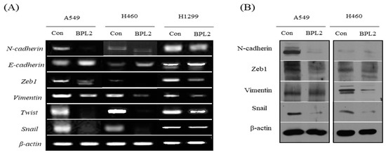 Levels of (A) EMT gene and (B) protein expression. (A) Gene expression in A549, H460, and H1299 cell lines following treatment with BPL2. (B) The protein expression in A549 cells following treatment with BPL2. β-actin was used as the control.