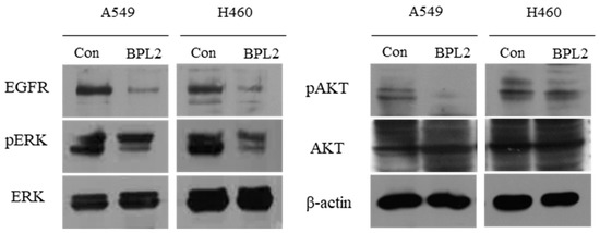 The levels of EGFR signaling-related protein expression were determined. EGFR in A549 and H460 cells decreased significantly upon BPL2 treatment. Activation of ERK and AKT, important downstream targets of the EGFR signaling pathway, reduced significantly (Figure 6).