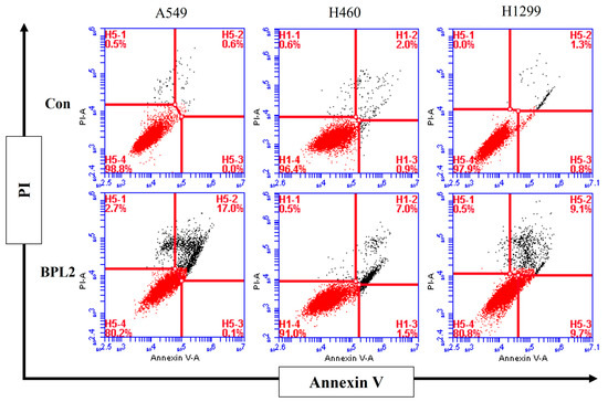 To evaluate whether treatment with BPL2 induced apoptosis, an Annexin V/PI staining assay was performed. After treatment with BPL2 at 20 μg/mL for 48 h, significant apoptosis induction was observed. The apoptosis rate increased to 17.1% (early: 0.1%, late: 17.0%) in A549, 9.5% (early: 1.5%, late: 7.0%) in H460, and 18.8% (early: 9.7%, late: 9.1%) in H1299 cells after treatment with BPL2. Necrotic cell death was observed at 2.7% in A549 and 0.5% in H460 and H1299 cells (Figure 7).
